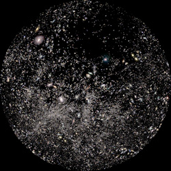 Quote: The 6dF Galaxy Survey has collected more than 120,000 red shifts over the southern sky over a 5 year period from 2001 to 2005. Its goal is to map our southern view of the local universe, and use the peculiar motions of one-tenth of the survey to measure galaxy mass. It covers more than eight times the sky area of the successful 2dF Galaxy Redshift Survey. This short (2.5 minutes) fulldome movie is a flight through the survey data with a galaxy image assigned at each location based upon the type of galaxy estimated by the survey. CreditsData: Anglo-Australian Observatory, 6dF data date: June 2006. Visuals and animation: Paul Bourke Music: Peter Morse, Glenn Rogers Galaxy textures: Duncan Forbes, Space Telescope Science Institute, NASA, Hubble Deep Field