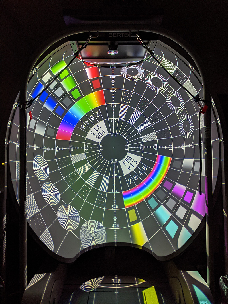 In order to create the warping specification one needs to know where any point in the fisheye image to be projected appears on the dome surface. One way to do this is to project a test image consisting of markers at known positions, in this case coloured dots. ![]()
