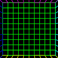 The following test pattern was used to test the correctness of the off-axis fisheye. It is a rendering of a cubic room, each wall is a different colour and constructed with a regular grid of bars. If the fisheye generation is correct the curved lines in the fisheye image should appear straight when projected onto the dome. The coordinate above each image is the position of the viewer.