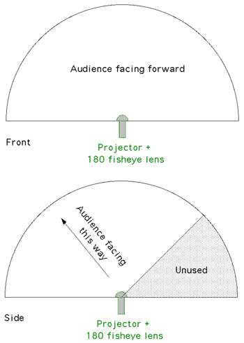 There exist a number of full dome environments that project angular fisheye or other radial functions. If the angular fisheye is created correctly then the resulting image after projection onto the dome surface appears undistorted. Unfortunately if the projector uses a single fisheye lens then the standard fisheye projection as described here requires that both the lens and the viewer are located at the center of the dome, obviously impossible. As the viewer moves away from the center the image appears increasingly distorted. This isn't normally a problem for large planetariums where the radius of the dome is very much larger than the seating area and in any case nothing can be done since there are multiple viewers. For smaller domes the effect is more marked and the viewer can easily move significant distances from the center. It is possible to create a modified fisheye image so that if viewed from a particular position the projected image will appear undistorted, this is called an off axis fisheye image. This is the same principle employed when creating stereo pairs where one uses an off-axis (asymmetric) perspective frustum for each eye.