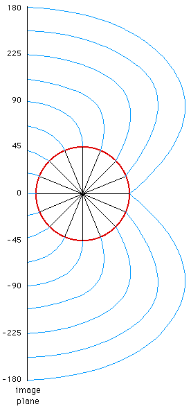 Some raytracing packages don't support a native fisheye camera, the question is often asked "can a spherical mirror be used to create a fisheye view?". The basic idea is to render the view of the scene by pointing the virtual camera at a perfectly reflective spherical surface. The answer is "the result is close but not exactly correct". Three rendering are shown below, the scene is simply a hemisphere represented as a regular grid of lines of latitude and longitude.