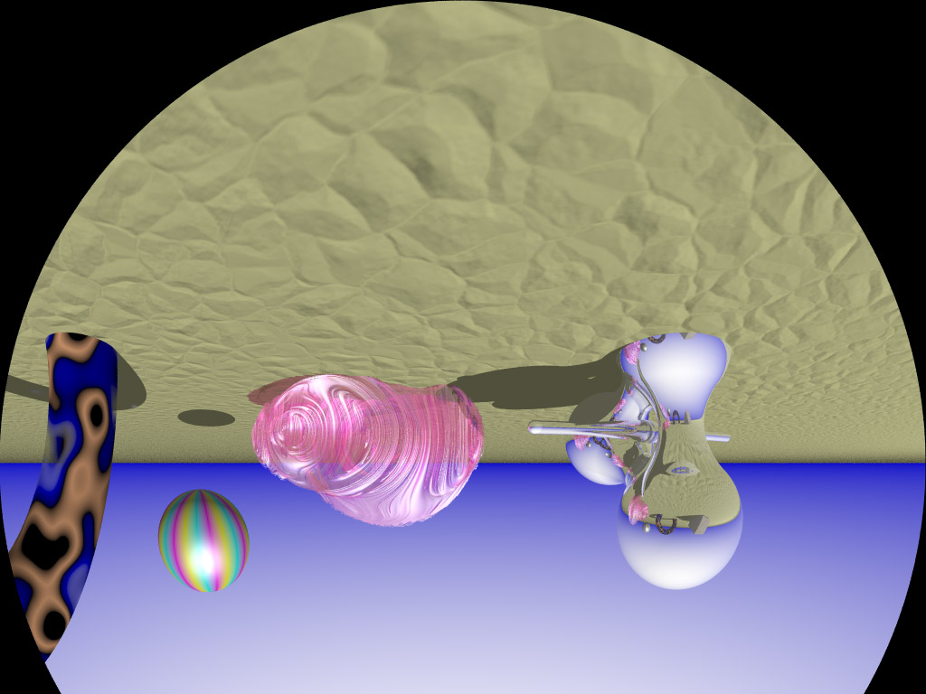 This example is rendered in PovRay onto a 5 wall cubic environment map, the off-axis fisheye is created from these 5 images. (5view.ini, 5view.pov, 5viewcamera.pov) This has the advantage of being able to create multiple offaxis fisheye images from one set of cubic environment maps, this would not be possible if the offaxis fisheye was rendered directly in PovRay (something that is easy to arrange by modifying the PovRay source code).