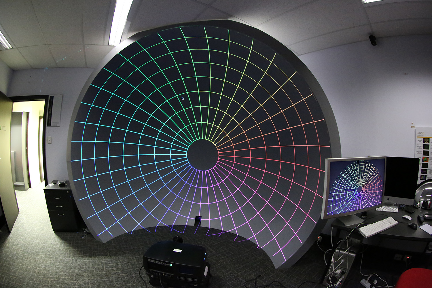 Hemispherical dome projection can be achieved with both multiple data projectors as well a single projector with a fisheye lens. Single projector systems have many advantages, in particular, they are simpler and generally have a lower cost of ownership and require a simpler software stack. The often quoted advantage of multiple projector systems is higher resolution but that comes at the expense of requiring edge blending which is rarely perfect. For many applications the recent availability of 4K (and higher) projectors provides a comparable result with a single projector. Unlike the planetarium industry where single projector systems are typically located in the center of the dome. For some dome configurations, for example for small personal domes such as the iDome, the center is ideally the space occupied by the viewer. The approach then is to locate the projector and fisheye lens either above the dome or, in the case of folded optics, under the floor at the base of the dome. In all cases the fisheye lens needs to have sufficient field of view and be positioned so that the entire dome surface is illuminated. In the case where the fisheye has 180 degree field of view horizontally, it generally then has 110 degrees field of view vertically (depends on exact aspect ratio). In all cases the fisheye image to be projected onto the dome, through the lens, needs to be warped so as to provide the correct result on the dome surface. The following presents a tool by the author to facilitate this warping. The options simultaneously include offine warping, mesh generation and GLSL shaders for realtime warping. The approach is to derive the warping by parameterisng all the relevant geometric and optical properties such as lens position and angle, dome radius, projector aspect ratio and degree of truncation. Installations using this solution are illustrated below. Vertically orientated projector