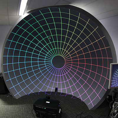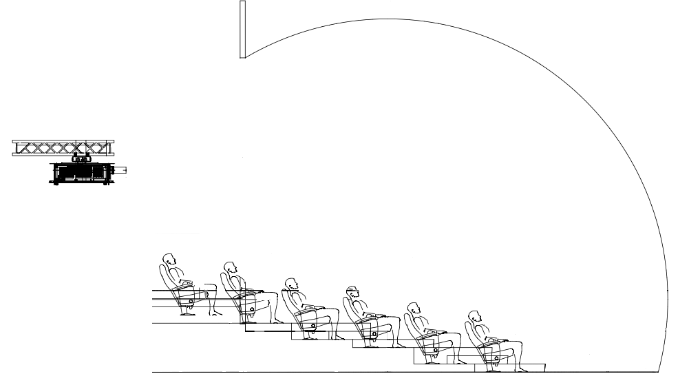 An example of a more traditional planetarium dome configuration using an offaxis fisheye lens is shown below. This is similar to the OmniMax theatre arrangement, in this case with just a 15 degree tilt.