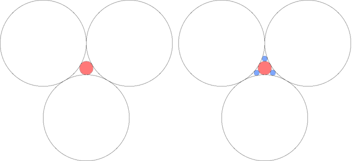 There are two circles which have these three circles as their tangent, they are called the inner and outer Soddy circles. The derivation of the radius of the inner and outer Soddy circles were studied by Frederick Soddy around 1936. The Apollony fractal is created by repeatedly filling the gaps between the circles with the inner Soddy circle. The first two iterations are shown below. ![]()