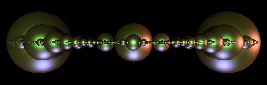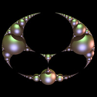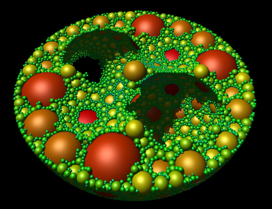 In 3D one starts with 4 spheres each at the vertices of a tetrahedron. A outer Soddy sphere is added that encloses the 4 spheres. The gaps are filled by subsequent Soddy spheres thus forming a solid object (at infinity). The result is often called an Apollonian sphere packing. The fractal dimension of the 3D Apollonian has been calculated as 2.473946 [M. Borkovec, W. De Paris, and R. Peikert]. The following shows the top half of the 3D Apollonian, with the outer and 4 tetrahedral spheres removed. As with most fractals, this is an approximation with "only" 40,000 spheres rather than the infinite number required for the true fractal. ![]()