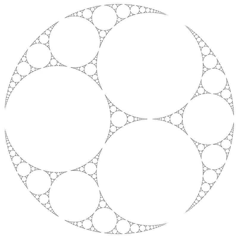Apollony FractalAlso known as the Apollonian Gasket or Curvilinear Sierpinsky GasketWritten by Paul BourkeJune 2003