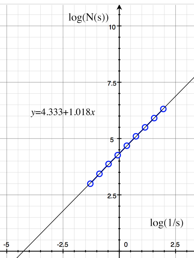 The theoretical value is 1. The log(N(s)) vs log(1/s) graph is shown below along with the slope estimate of 1.018.