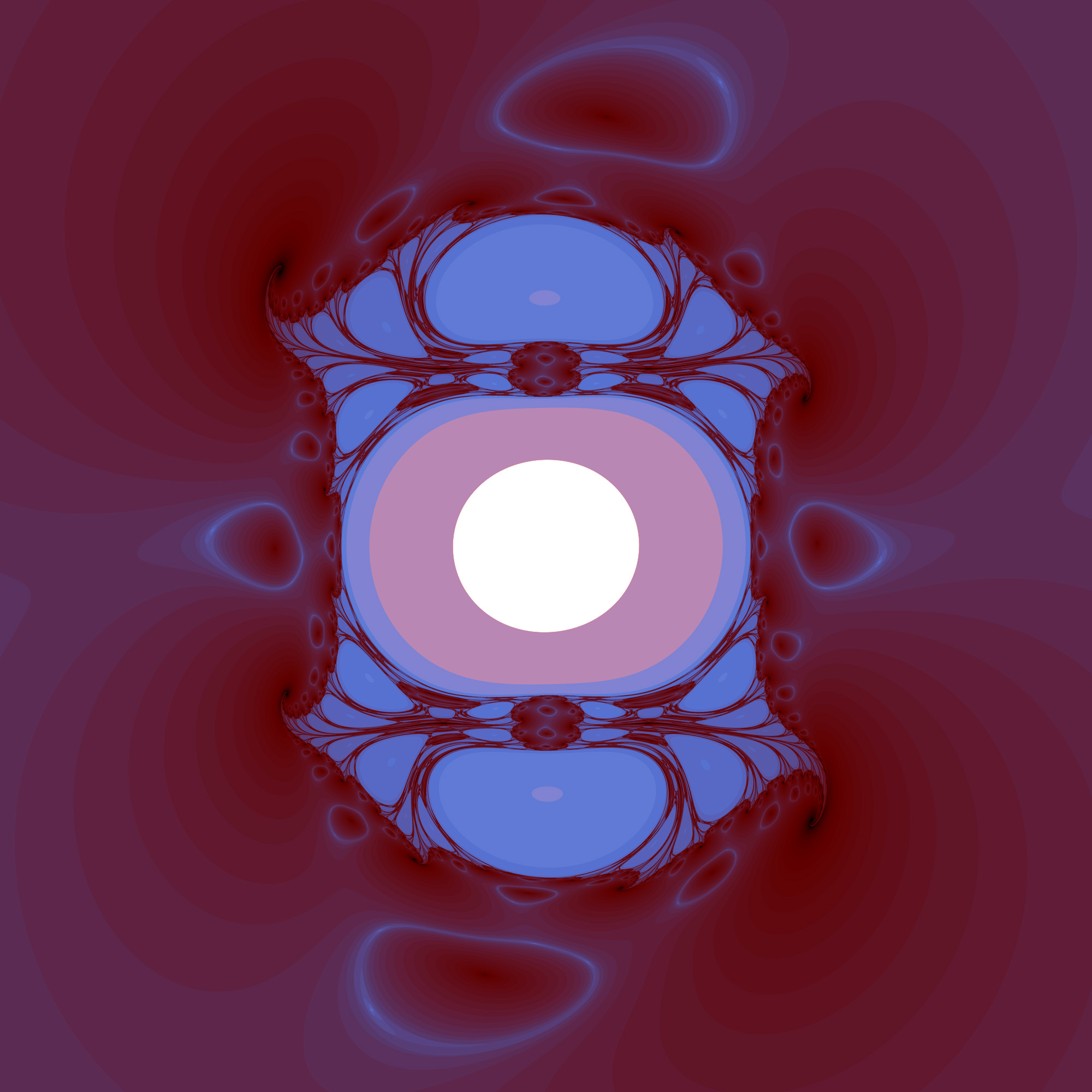 This fractal is calculated in a similar way to the Mandelbrot, that is, a series is calculated and coloured according to how quickly it escapes to infinity. The main difference is that the series in this case is somewhat more complicated. For a coordinate (x0,y0) one forms a complex number z0 = 1 / (x0 + i y0), this becomes the first term of the series. The series is given by