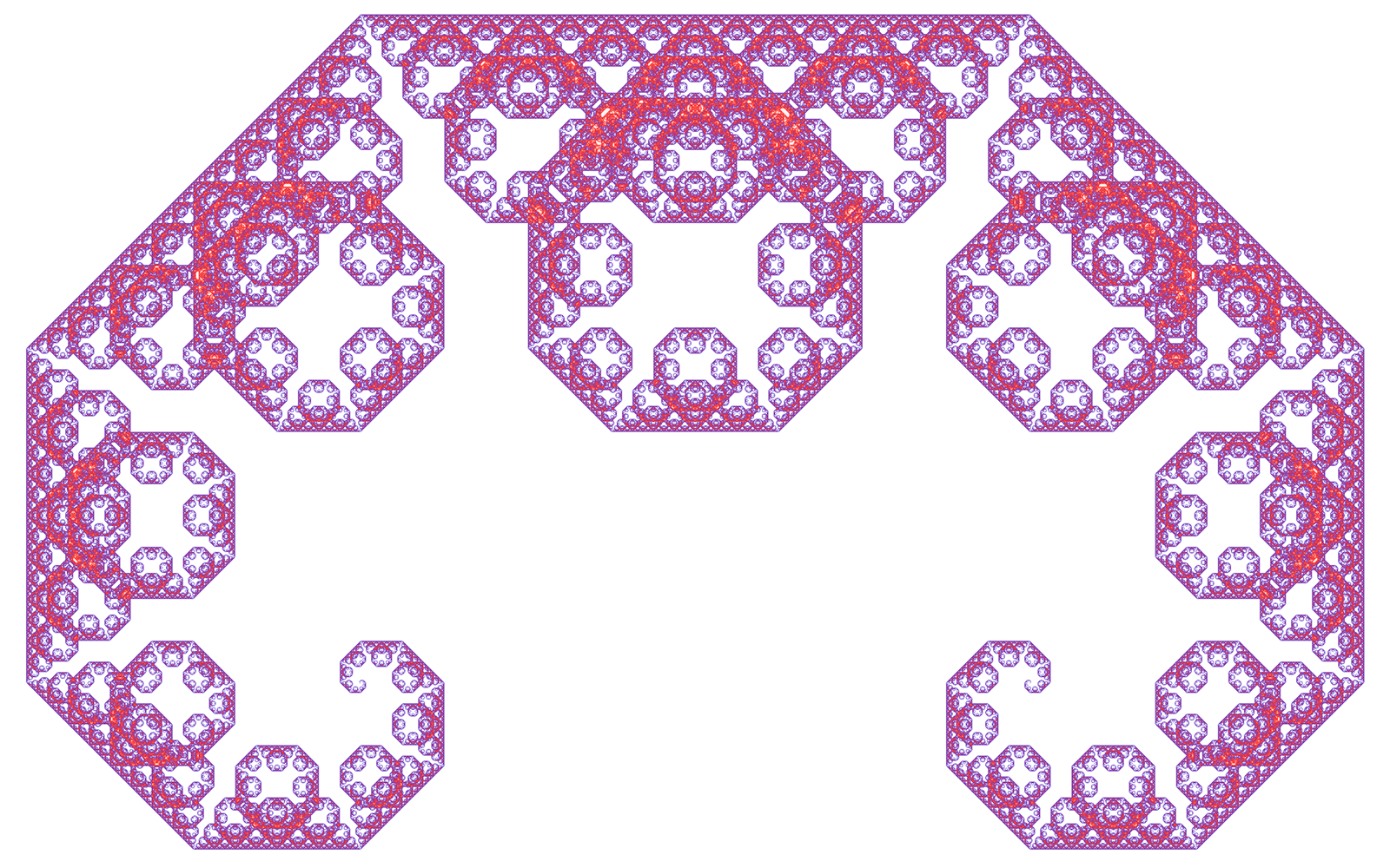 Lévy CurveAlso known on the "C curve" when drawn on its sideWritten by Paul Bourke February 2018 First reported by Ernesto Cesàro in 1906 and Georg Faber in 1910 but named after Paul Lévy who studied its properties in more depth. It can be formulated as both a L-System and IFS (Iterated Function System, both as provided below. L-System formulationaxiom = F F -> -F++F- angle = 45 ![]() 6th iteration, 316 line segments