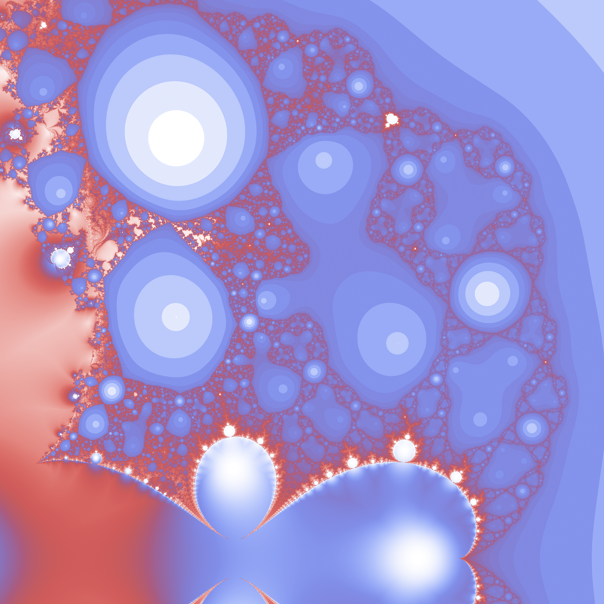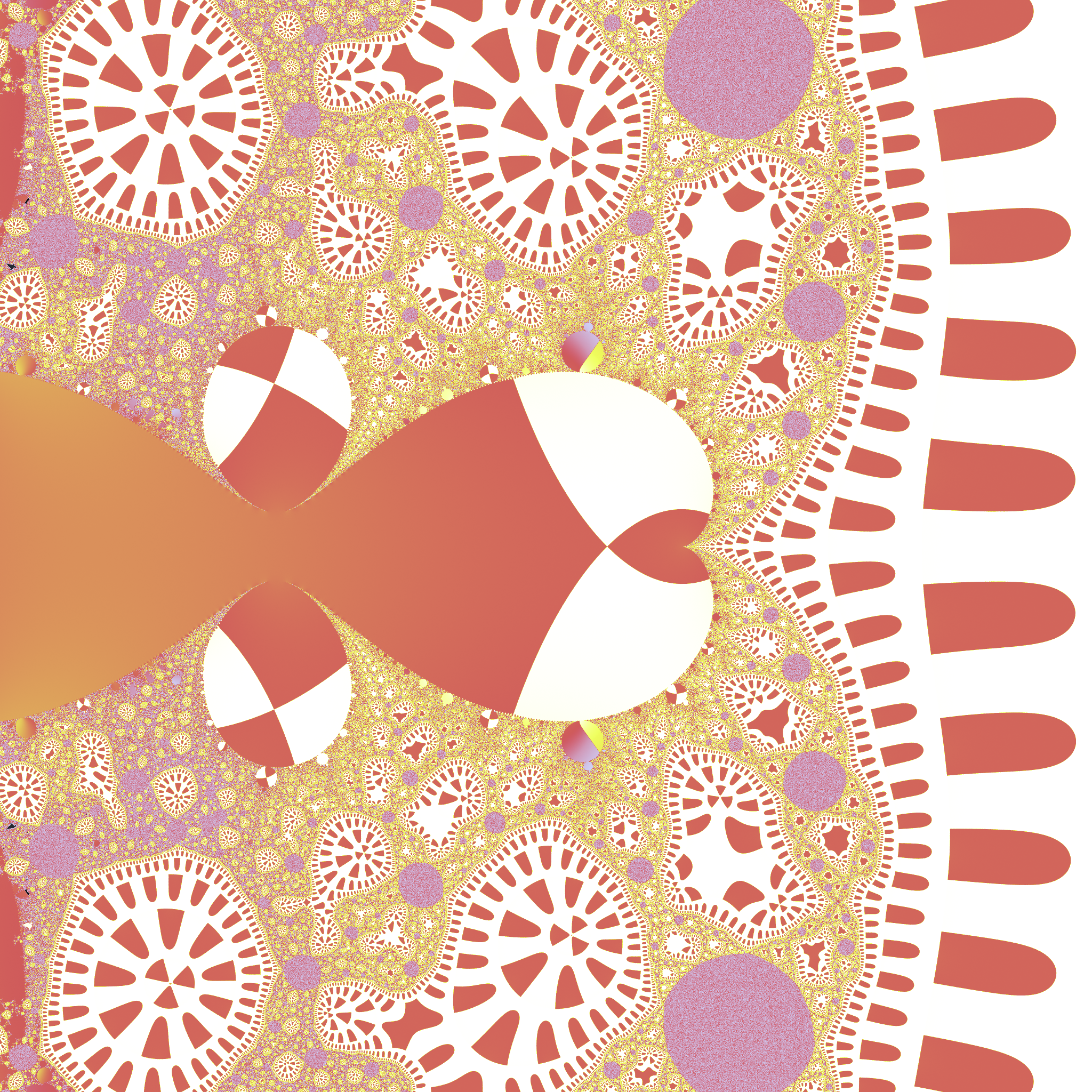 FracInt: These fractals use formulae derived from the study of hierarchical lattices, in the context of magnetic renormalisation transformations. This kinda stuff is useful in an area of theoretical physics that deals with magnetic phase-transitions (predicting at which temperatures a given substance will be magnetic, or non-magnetic). In an attempt to clarify the results obtained for real temperatures (the kind that you and I can feel), the study moved into the realm of Complex Numbers, aiming to spot Real phase-transitions by finding the intersections of lines representing Complex phase-transitions with the Real Axis. The first people to try this were two physicists called Yang and Lee, who found the situation a bit more complex than first expected, as the phase boundaries for Complex temperatures are (surprise!) fractals.