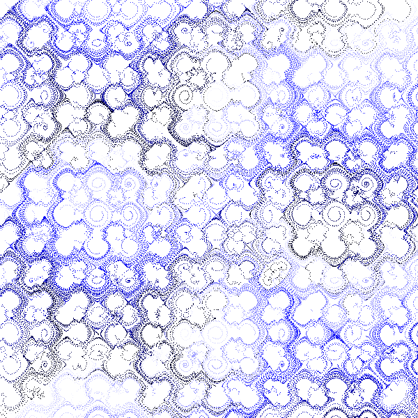 The traditional approach involving the evaluation the series at a subsampling of the points on the plane was largely due to limited graphics and processing power of the day. More continuous images can be created if every pixel is used as the initial conditions of the series, indeed one can even choose finer sub pixel samplings. Instead of drawing the series directly one forms a 2 dimensional histogram, every pixel in the image containing the number of times that position occurred during the evaluation of the series. The colouring of the histogram is then left as a post production exercise, mapping histogram value to some colour gradient.
