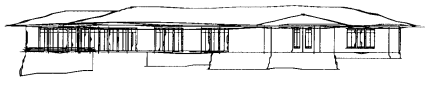 There are three ways these effects might be achieved. The first is to create or modify an output device so that it can replicate the attributes of a human drawer. There are possibilities here for robot arms which can easily be designed to hold a variety of drawing implements and programmed to draw in specified styles. A somewhat unusual attempt at computer sketching is to attach a pen to a plotter loosely with elastic and tape, the result being that the pen wobbles around during a plot giving the desired imprecise appearance. A second technique is to modify the drawing instructions on their way from the CAD software to the output device. For example the vectors could be intercepted and changed to give the appearance of a human sketch before being forwarded to the plotter. The approach used here is to modify the geometry of a 3D model itself. Both of the effects mentioned above are quite easy to simulate by computer using random and fractal methods. Non-intersecting lines are achieved by extending both ends of line segments by a random distance. The distance should be related to the line length, the application I developed allowed a range of overshoots from between zero and a user chosen maximum. The wiggly line effect was generated by a well known technique from fractal geometry called "random midpoint displacement". It takes a straight line segment and generates a fractal curve by repeatedly splitting lines and perturbing their midpoint, the degree of wiggle is easily controlled by the user. Convincing sketches can be created with these techniques. It should be noted that the result is a "3D sketch" from which hardcopy can be created from any view and projection. The following examples are LaserWriter prints showing a number of views of one of these 3D sketches with a selection of overshoot and wiggle parameters. ![]() House, front view