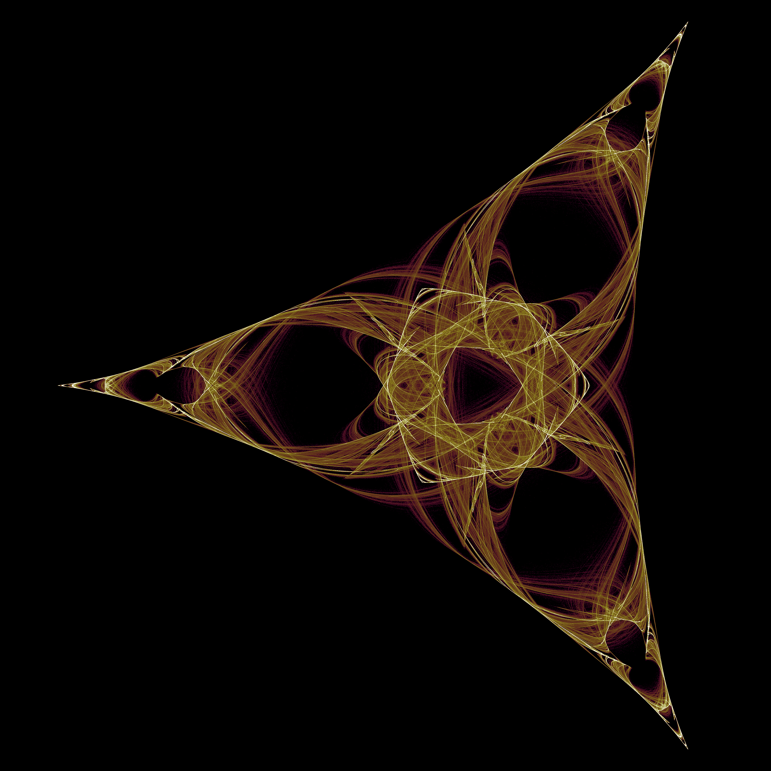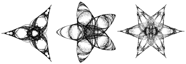 This article is a result of experimentation with the reverse iteration of the fixed point Julia. In the calculation of the formula: There are many ways you can put together the signs and there are two ones that can be made harmonic. In a series of experiments with up to four IFS transforms I got a series of stars from an experimental program by replacing one with: Where n and m are integers. I got a lot of other fractals by varying the signs, but these stars are the pretty results.