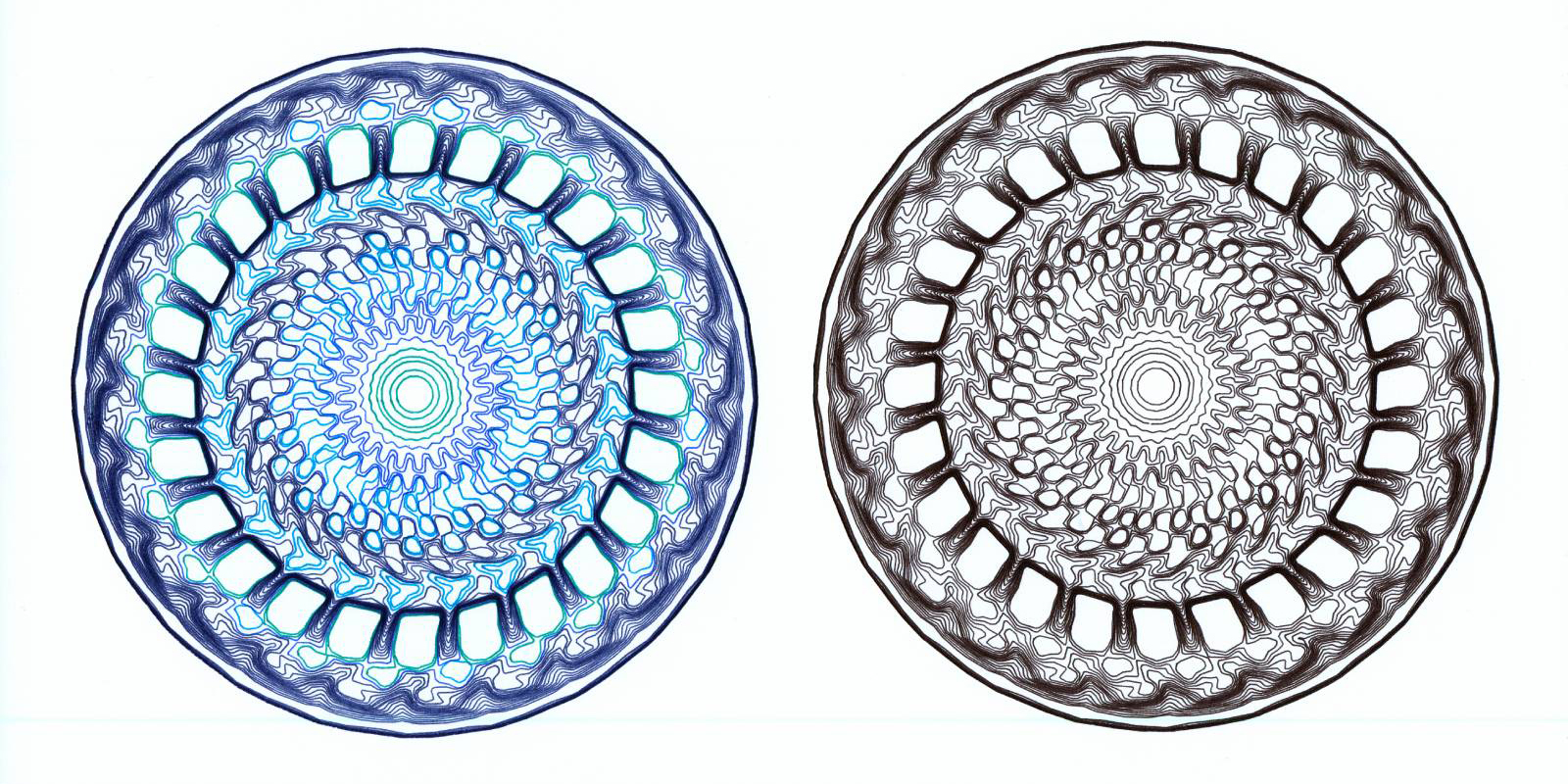 The images above are generated by iterating the functions many millions of times, on each iteration drawing a single point on the plane, building up a smooth density map. In the following the density map is contoured and the attractor drawn using a 2D pen plotter.