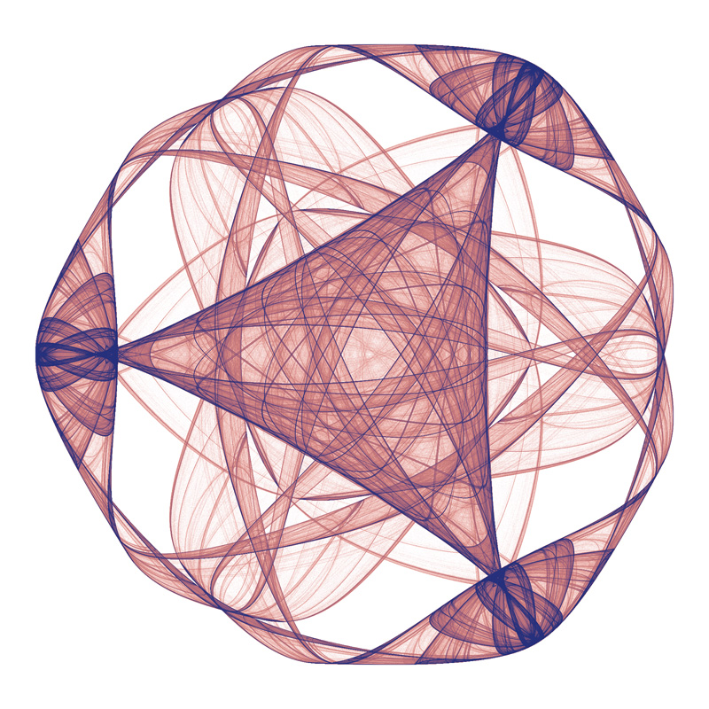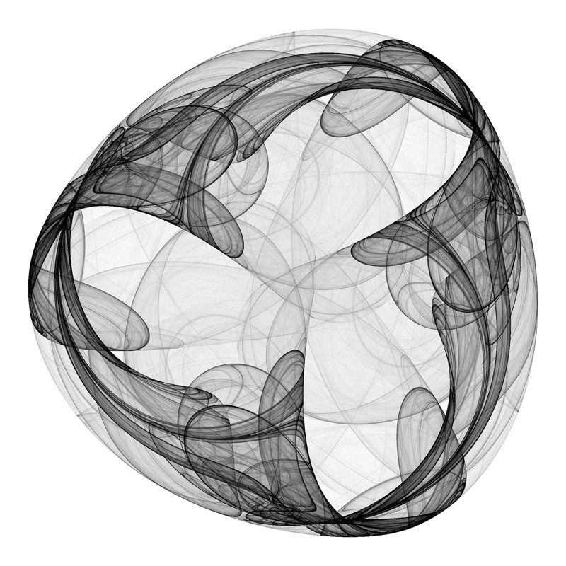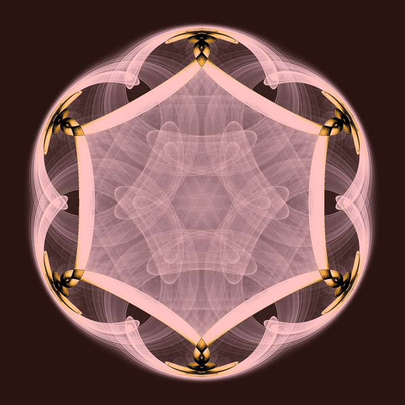 The images here are generated by iterating the series typically 1,000 million times. This is performed in two passes, the first pass with many fewer iterations is used to find the bounds of the attractor on the complex plane, the second pass actually "draws" the attractor points. The process of drawing involves treating the bounded region of the complex plane as a 2D histogram, each time the series passes through a pixel region on the plane the histogram at that location is incremented. One might imagine the 2D histogram as a height field, a larger values at a point indicate that the complex series passed through that pixel more often than a point with a smaller value. At the end of the process the histogram is mapped onto colours depending on the histogram values, there are many ways to do this based on aesthetic grounds. ![]() Emperors Cloak