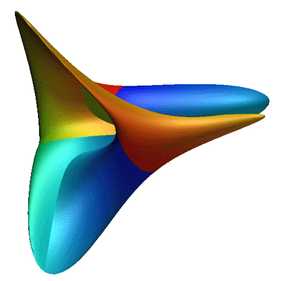 Boy Surface #1Written by Paul BourkeJanuary 2004 Projective plane without singularities. x = A (cos(u) cos(2v) + B sin(u) cos(v)) cos(u) / (B - sin(2u) sin(3v)) y = A (cos(u) sin(2v) - B sin(u) sin(v)) cos(u) / (B - sin(2u) sin(3v)) z = B cos(u) cos(u) / (B - sin(2u) sin(3v)) where A = 2/3 and B = sqrt(2) and 0 <= u,v <= pi