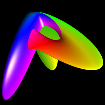 Boy Surface, #2Written by Paul BourkeJanuary 2004 Projective plane without singularities. x = cos(t) sin(s) y = sin(t) sin(s) z = cos(s) x| = A ((2 x2 - y2 - z2) + 2 y z (y2 - z2) + z x (x2 - z2) + x y (y2 - x2)) y| = B ((y2 - z2) + z x (z2 - x2) + x y (y2 - x2)) z| = C (x + y + z) ((x + y + z)3 + 4 (y - x) (z - y) (x - z))