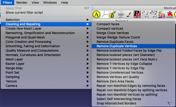 Too be safe, remove duplicate vertices. This seems to happen automatically in MeshLab when importing models in some formats (like stl) but it doesn't occur for other 3D formats (like OBJ). Ensuring shared vertices is important, one may like to remove duplicate faces if the mesh is originating from a poor exporter.