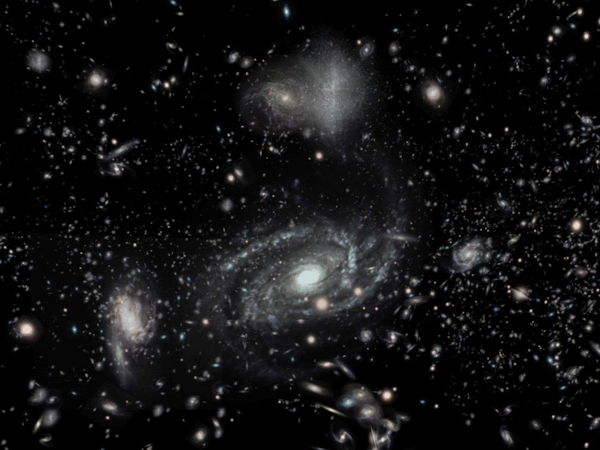 Space. To many people it is one of the most interesting and awe inspiring places ever contemplated, but the reality is quite different. In fact, it is called space because there is a lot of just that - space! One of the most difficult aspects of visualising the Universe is the problem of all this empty space. This problem was evident in preparing "A Flight Through the Universe". The distance between individual galaxies is typically about 100 times (or more) larger than the size of an individual galaxy. Therefore, flying through a completely realistic simulation of the large-scale structure of the Universe would be a seemingly eternal journey through a collection of "dots". Although such a model would be more accurate, it would not quite have the visual impact that was required for the project. Consequently the size of individual galaxies was exaggerated by two orders of magnitude to enhance the aesthetics, which had the added benefit of making some subtle aspects of large-scale structure (such as the existence of groups and clusters of galaxies) more obvious. It is interesting to note that the ratio of size of individual stars to their average separation within our Galaxy is many orders of magnitude greater than the ratio for individual galaxies within the Universe. A realistic flight through our Galaxy would make a journey through a "dot" Universe look positively exciting! 3.2 All it Takes is Time