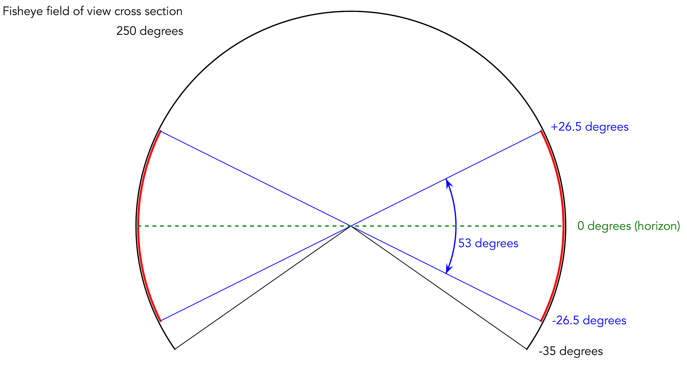 Another category of solutions are called catadioptric panoramic cameras, which use curved mirrors (cones, paraboloids, hyperboloids, etc) combined with a conventional lens (usually pointed upward) to create a wide-angle or full-circular panorama in a single shot, without stitching. Given that only 53o are needed, one can simply use a fisheye lens pointing straight up, and extract a cylindrical panorama from the outer rim of the resulting fisheye video. For the installation here we need a vertical field extending from −26.5o to +26.5o, which can be covered by a 233o fisheye. At the time of writing, Entaniya produces a 250o fisheye lens, which more than satisfies this requirement. Below is an example image taken with that lens. ![]()