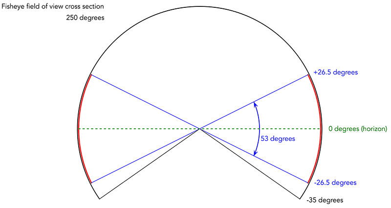 Using only about 233o of the full 250o gives some margin, especially since full-frame sensors may slightly crop the fisheye circle in certain modes (for example, if not using “open gate”). It also allows avoiding the worst of the non-linearity, any brightness fall-off (vignetting), and softness at the extreme edges. ![]()