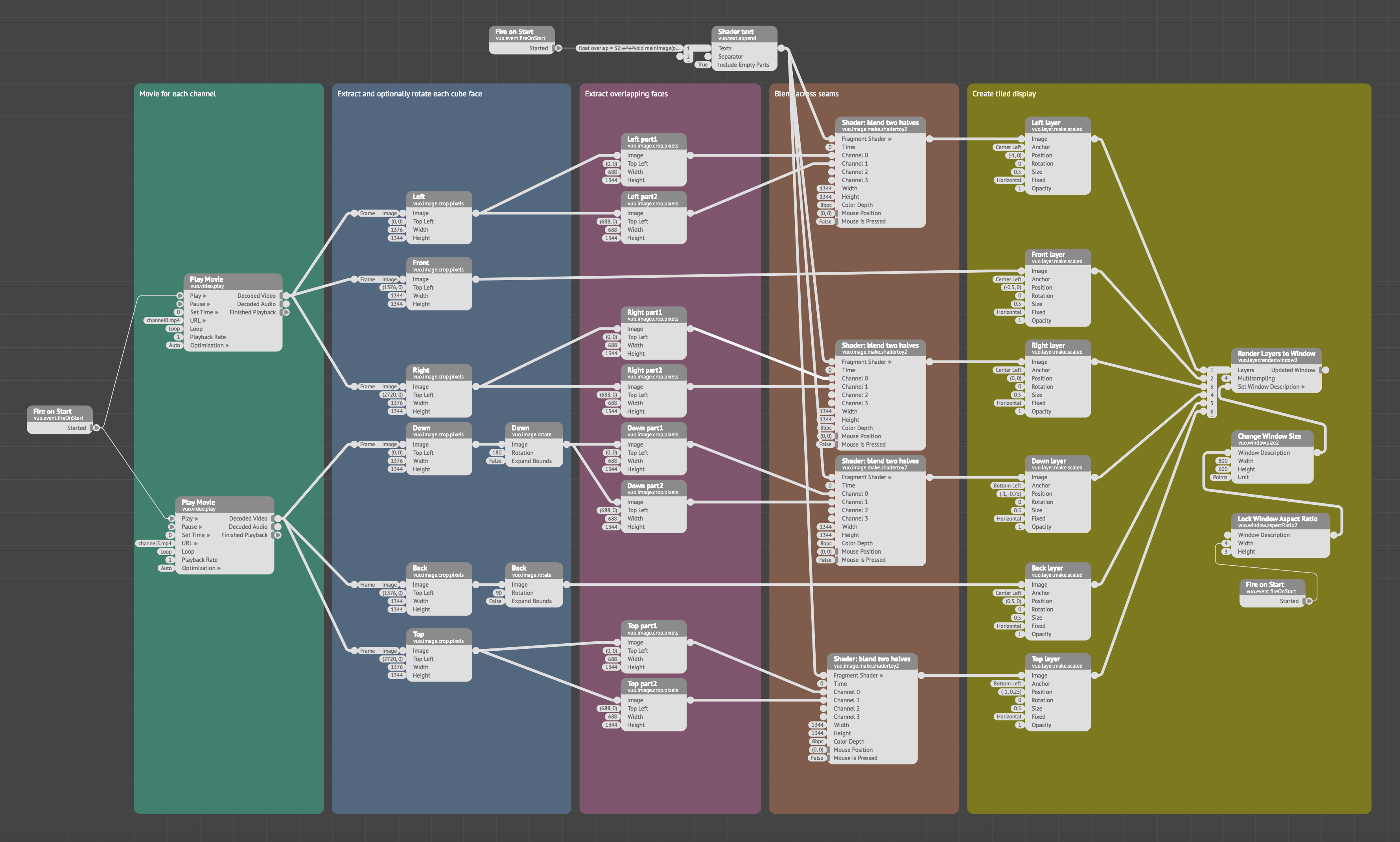 Armed with the above information it isn't difficult to extract the cube map faces, fix up the overlap on the 4 faces that require it, and export the plain cube maps or form an equirectangular. Two implementations have been created, the first uses Vuo to extract the cube faces, it uses a simple shader to do the blending across the overlap region. Optionally a subsequent shader could be used to create the equirectangular, in Vuo this can all be performed in realtime. The Vuo project that extracts and processes the cube map faces is shown below, the reader should be able to conform the dimensions for the various parts matches those shown in the first layout described above.