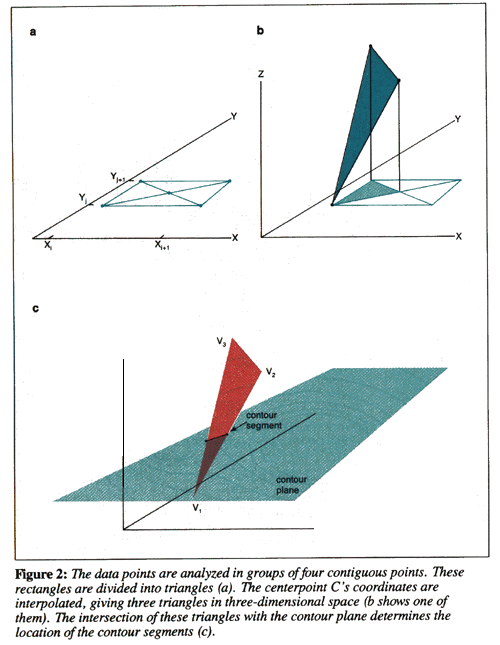 In summary, CONREC takes each rectangle of adjacent data points and splits it