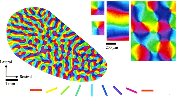 Orientation Preference in Tree Shrew: Complete map of orientation preference (left) and detail of singularities, linear zone and saddlepoints (right). Reproduced from Bosking et al (1997).