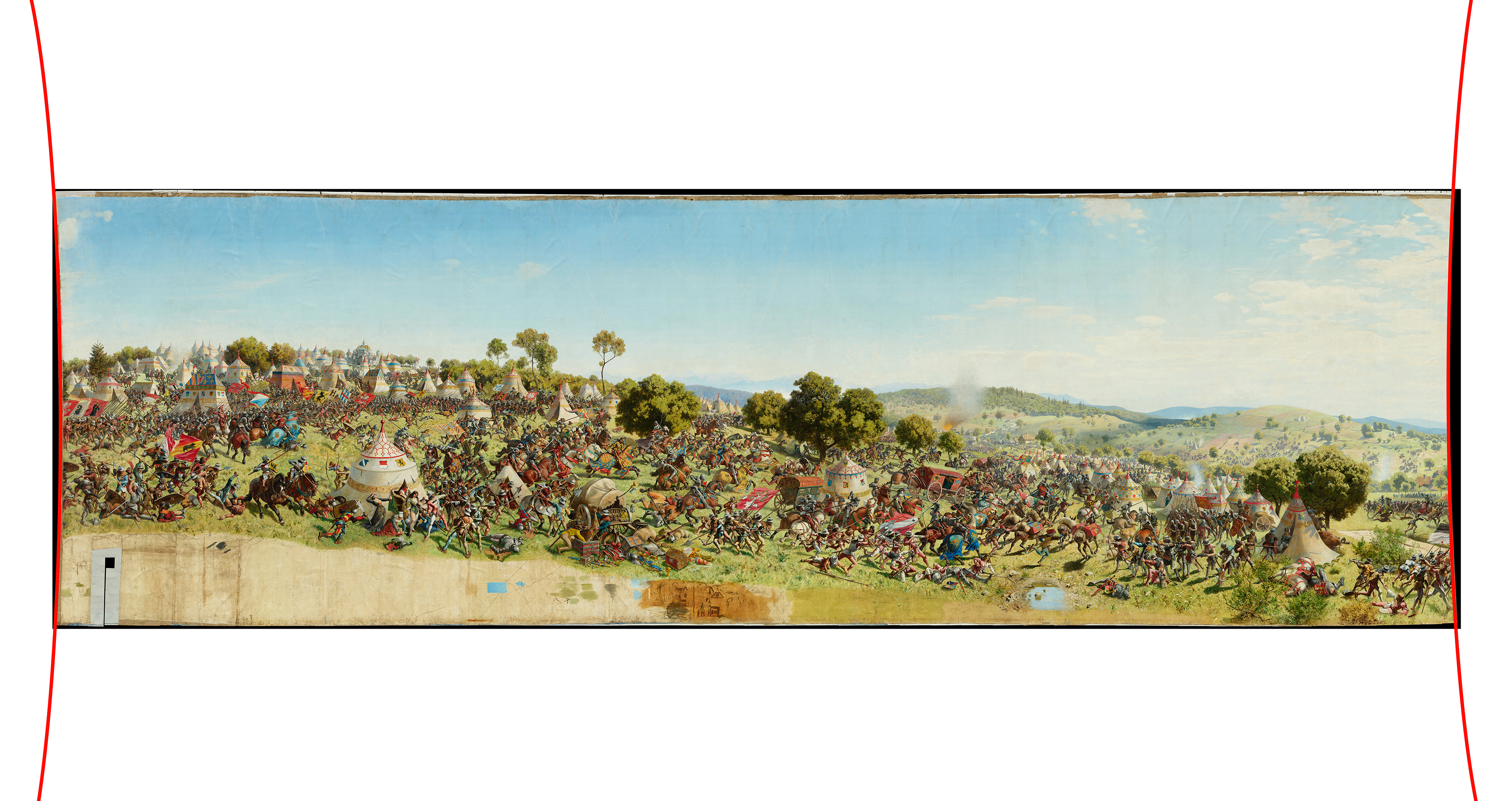 For a brief history of the painting, it was painted during 1893-1894 by a team of painters lead by Louis Braun. It depicts the battle between the Swiss Confederates and their allies against the army of the Duke of Burgundy in 1476. It was first exhibited between 1894 and 1909 in custom designed rotunda style buildings in Geneva and Zurich. In 1924 it was put into storage where it stayed until a restoration process was conducted, starting in 1996. The painting was briefly put on display at the 2002 Swiss national exposition, located in a cubic structure (monolith) on Lake Murten. Following the exposition the painting was put back into storage within a Swiss mountain facility where it has stayed until 2022 when this digitisation project started. For more information on the history and subject matter of the painting the reader is referred to documentation supplied by the "Foundation [2] for the Panorama of the Battle of Murten".