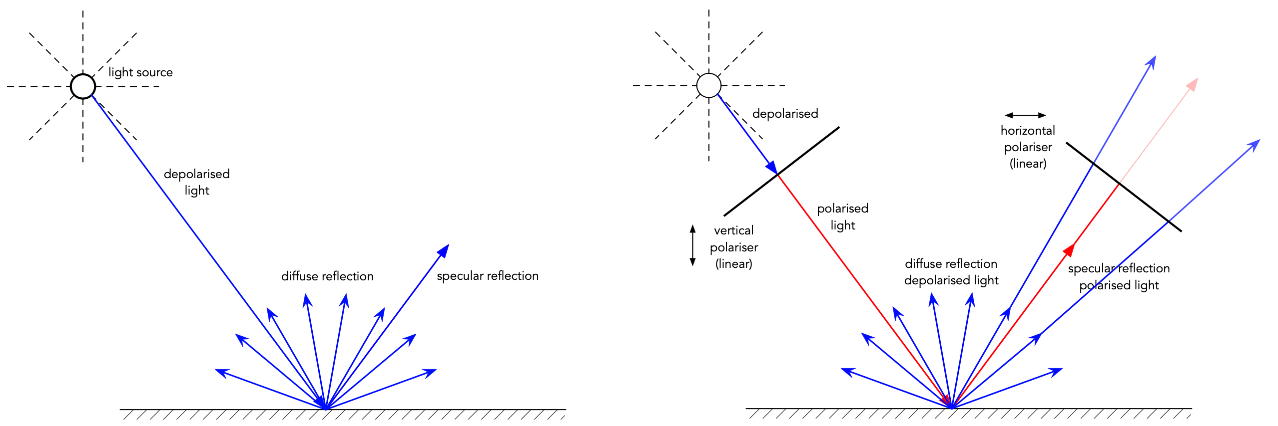 Difference between standard lighting (left) and cross-polarisation lighting (right)