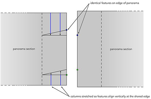 The two cases are illustrated below. The red line is shorter on the scroll than the blue lines and this is resolved in the stitch by warping as shown.