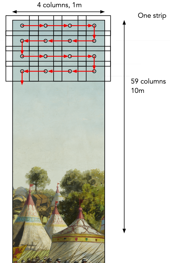 The painting measures about 10 m high and 100 m long, and exists in three parts, each on a separate roll. The project aimed at scanning it at 1000 DPI (dots per inch) or in metric units, 40 pixels per mm, the approximate width of a human hair. The resulting image, combined, is therefore calculated to be around 400,000 pixels high and 4 million pixels long. It is expected to be the highest resolution digital scan of an artwork. In 2004 a modest resolution (0.5 pixels per mm) digital version was created by Cuno Vollenweider by digitising and manually merging/blending together the photographs taken during the 2001 restoration.