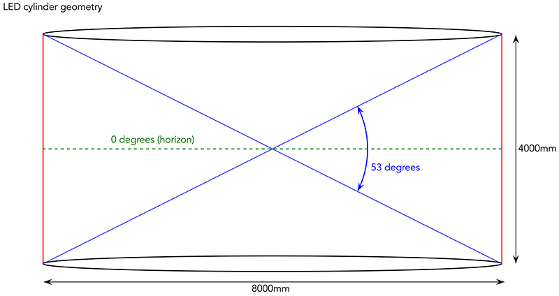 This document describes a method for creating 360° video for a cylindrical display, in this case, an LED cylinder measuring 8 m in diameter by 4 m in height, with 12,816 pixels around the circumference and 2,048 pixels vertically. Often this is achieved using one of the modern multi-camera 360° video systems able to approach the required ~12K resolution (at the time of writing, examples include the InstaPro2, Titan, Obsidian Pro, or Meta-4). The video from these cameras is normally stitched into equirectangular projections, from which a cylindrical panorama is extracted. However, those systems consist of multiple cameras whose projection points do not coincide; because of a fundamental property of imaging, the seams from stitching between the camera images can never be perfect. A traditional 360o camera captures about 180o vertically, but a cylindrical display typically requires much less (53o in this case calculated as 2*atan(2000/4000). That means most of the vertical field of an equirectangular projection is discarded. ![]()