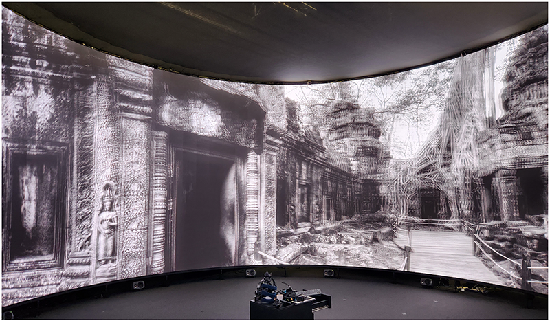 Another category of solutions are called catadioptric panoramic cameras, which use curved mirrors (cones, paraboloids, hyperboloids, etc) combined with a conventional lens (usually pointed upward) to create a wide-angle or full-circular panorama in a single shot, without stitching. Given that only 53o are needed, one can simply use a fisheye lens pointing straight up, and extract a cylindrical panorama from the outer rim of the resulting fisheye video. For the installation here we need a vertical field extending from −26.5o to +26.5o, which can be covered by a 233o fisheye. At the time of writing, Entaniya produces a 250o fisheye lens, which more than satisfies this requirement. Below is an example image taken with that lens. ![]()