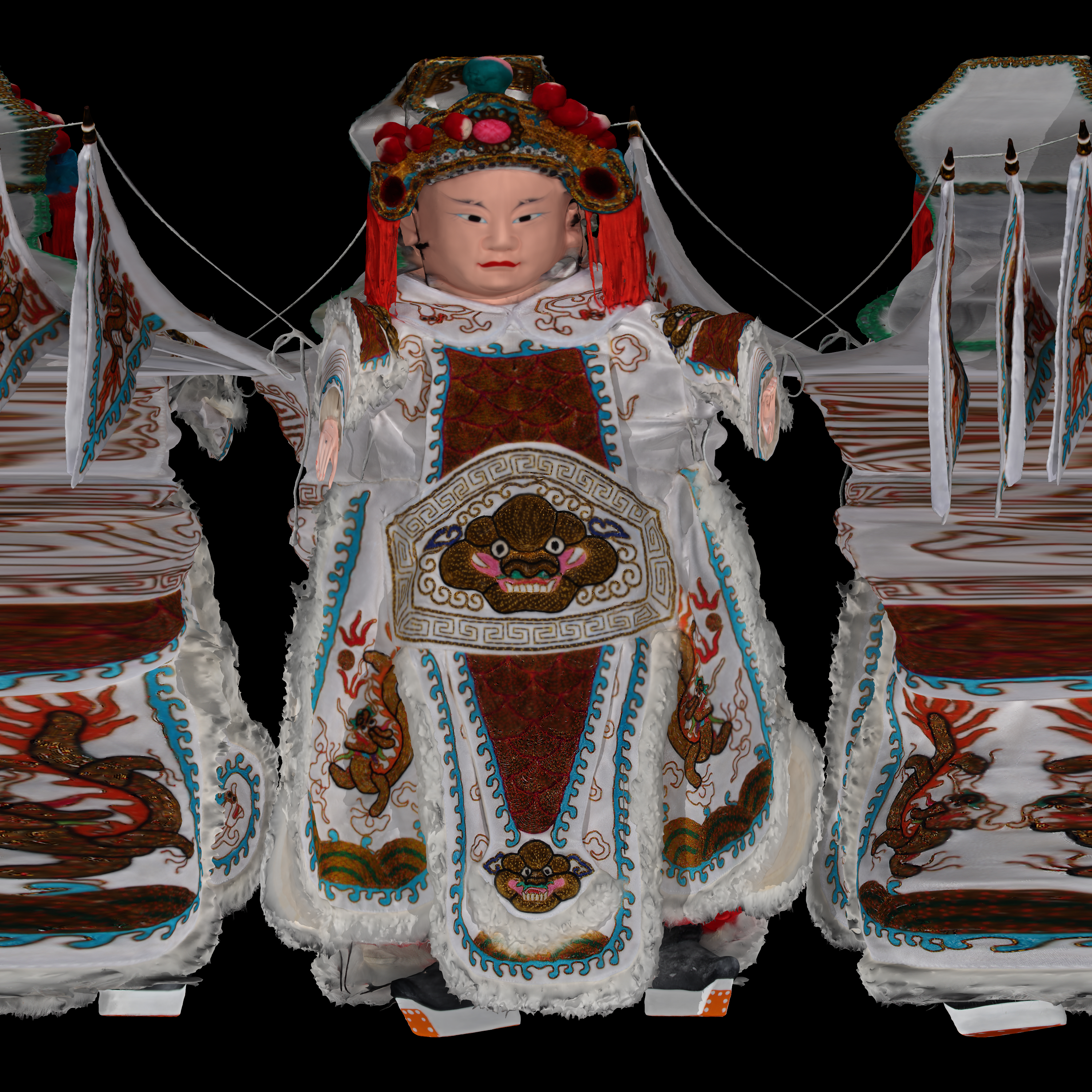 The images created here were the authors own code that, for each pixel in the output image, the corresponding ray is computed (position and direction). That ray is then intersected with all the triangles in the model (OBJ file), once the closest (first) intersection is determined the colour is looked up given the uv coordinates and the texture image. The new (and exciting) "mesh_camera" in PovRay can be used to achieve the same thing. This camera allows one to specify the camera ray position given the triangle in a mesh{}, the direction of the ray is determine by the normal (so all triangles must be ordered consistently) although the ray can be flipped with the sign of the z coordinate in the direction directive.