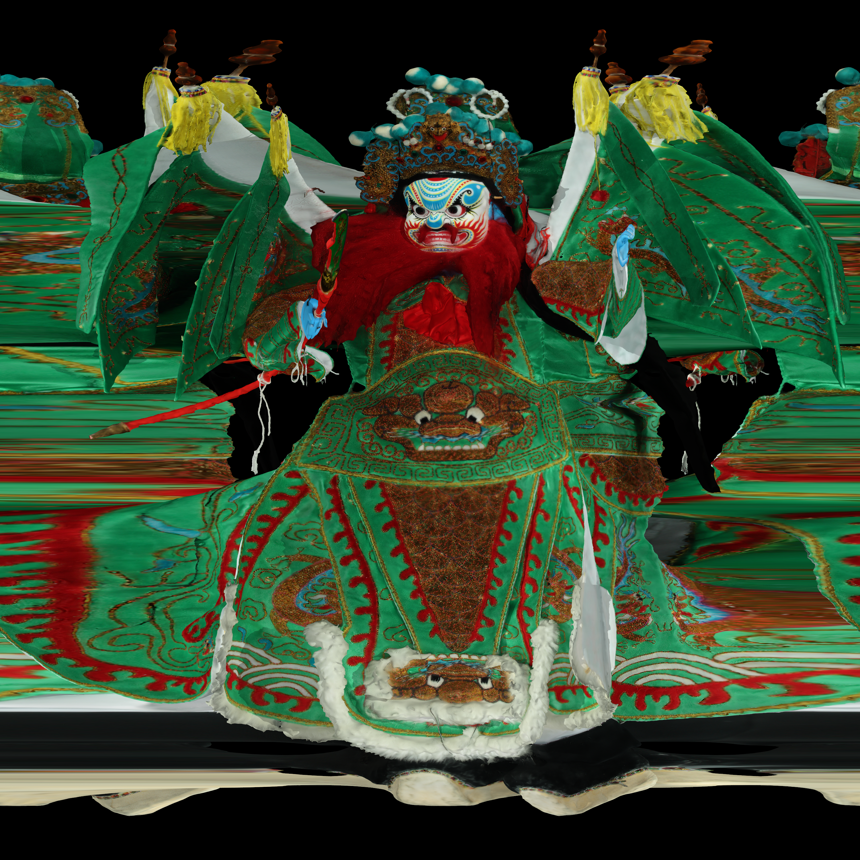 Of course one is not limited to a cylindrical panorama, a full equirectangular panorama can equally be generated. Each pixel corresponds to a ray origin on a sphere, the ray direction is towards the center of the model.
