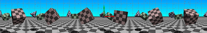 Rotating cubes at 3m away from the camera, cylinders at 4m, cones at 5m away